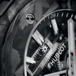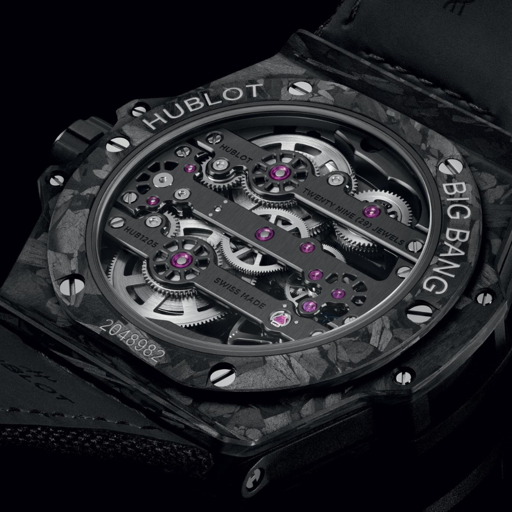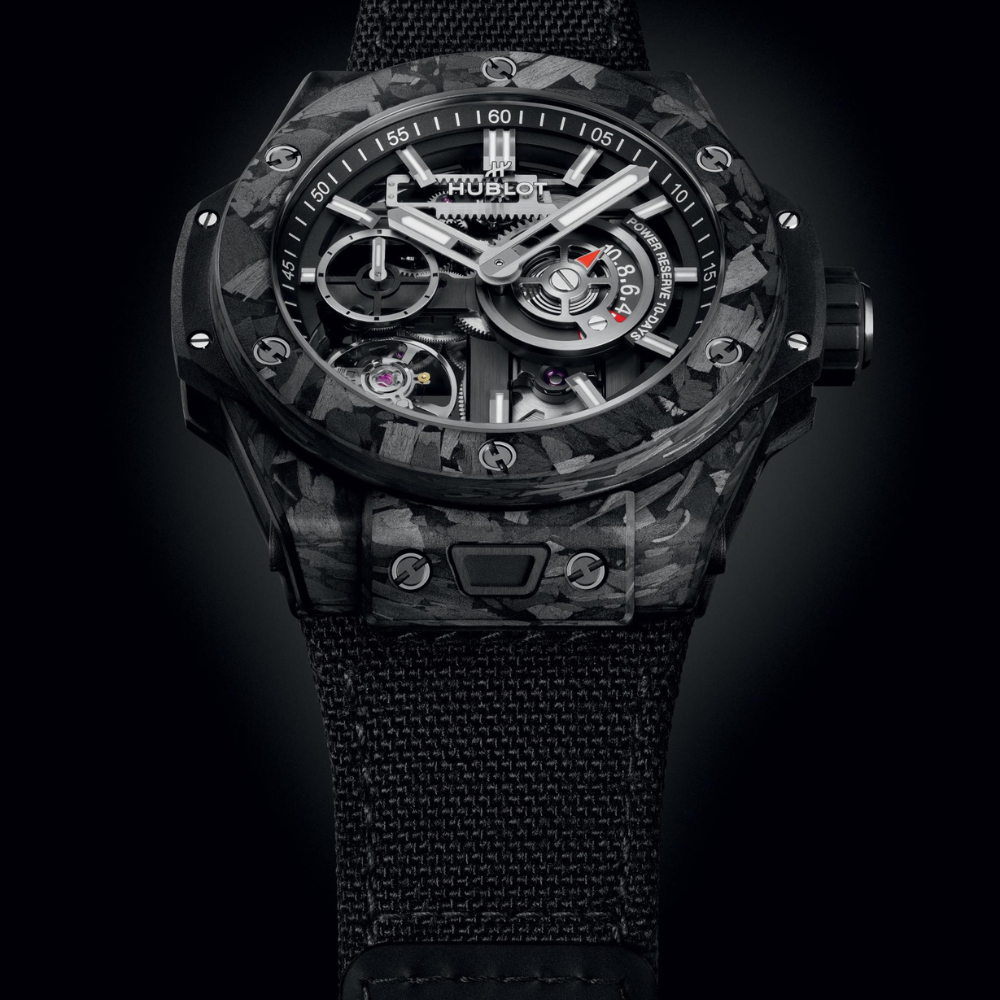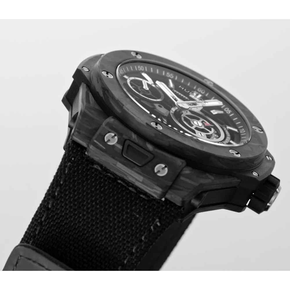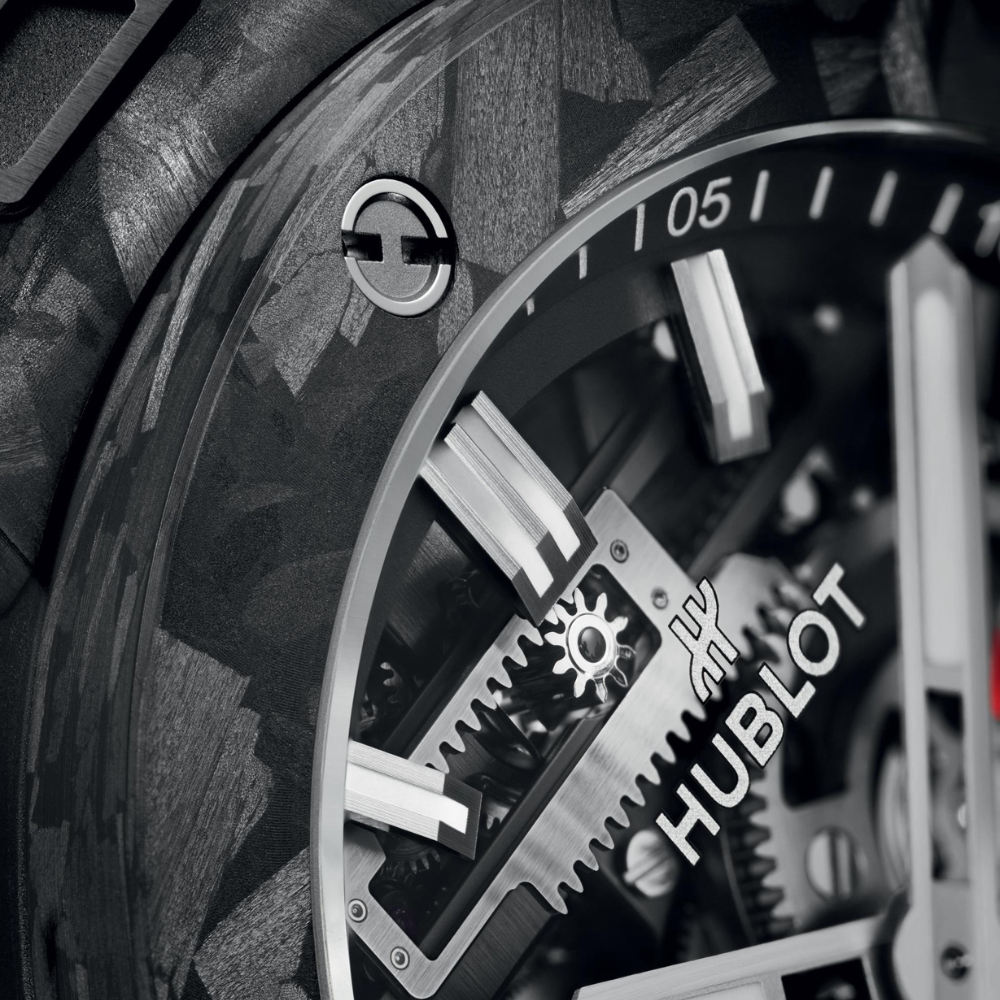 • Bezel: Frosted carbon with Hublot’s iconic H-shaped screws.