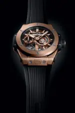 The Hublot Big Bang Meca-10 King Gold 42 mm showcases the perfect harmony of technical innovation and opulent design. Crafted in Hublot’s exclusive 18K King Gold alloy, this watch combines warm elegance with a highly technical skeletonized aesthetic. Its in-house HUB1201 manual-winding movement offers an extraordinary 10-day power reserve, making it a masterpiece of endurance and craftsmanship.