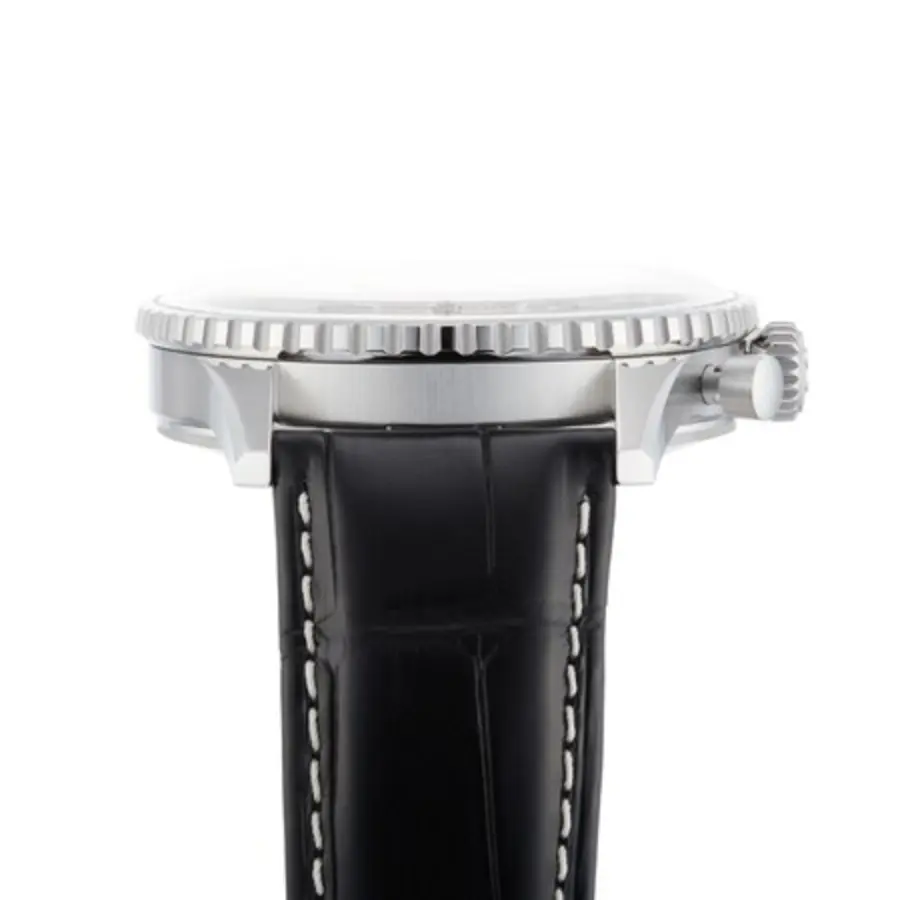 The sleek black dial is contrasted with silver-toned chronograph sub-dials and luminous hands. The classic AOPA wing logo returns to its 12 o’clock position — a nostalgic nod to the Navitimer’s roots. Protected by a domed sapphire crystal, the watch retains maximum legibility and elegance, even in flight conditions.