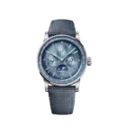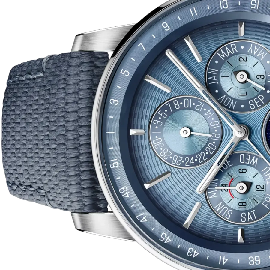 - Bracelet / Strap: Blue alligator strap with white gold folding clasp.