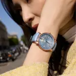 - Dial: Light blue; pink-gold applied markers & hands with lume