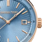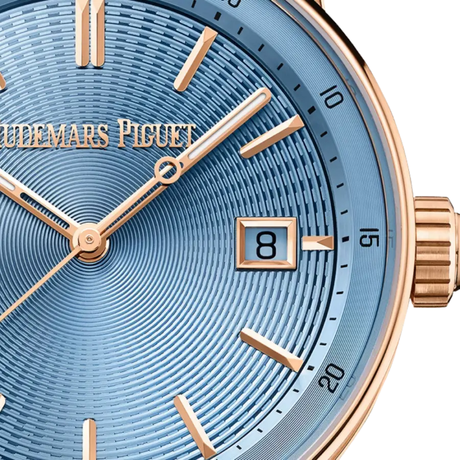 The Code 11.59 77410OR offers the line’s architectural casework and clean dial design in a versatile 38 mm size. With its light-blue palette, pink-gold case, and efficient calibre 5900, it’s a refined daily companion that balances contemporary style, comfort, and enduring AP craftsmanship.
