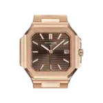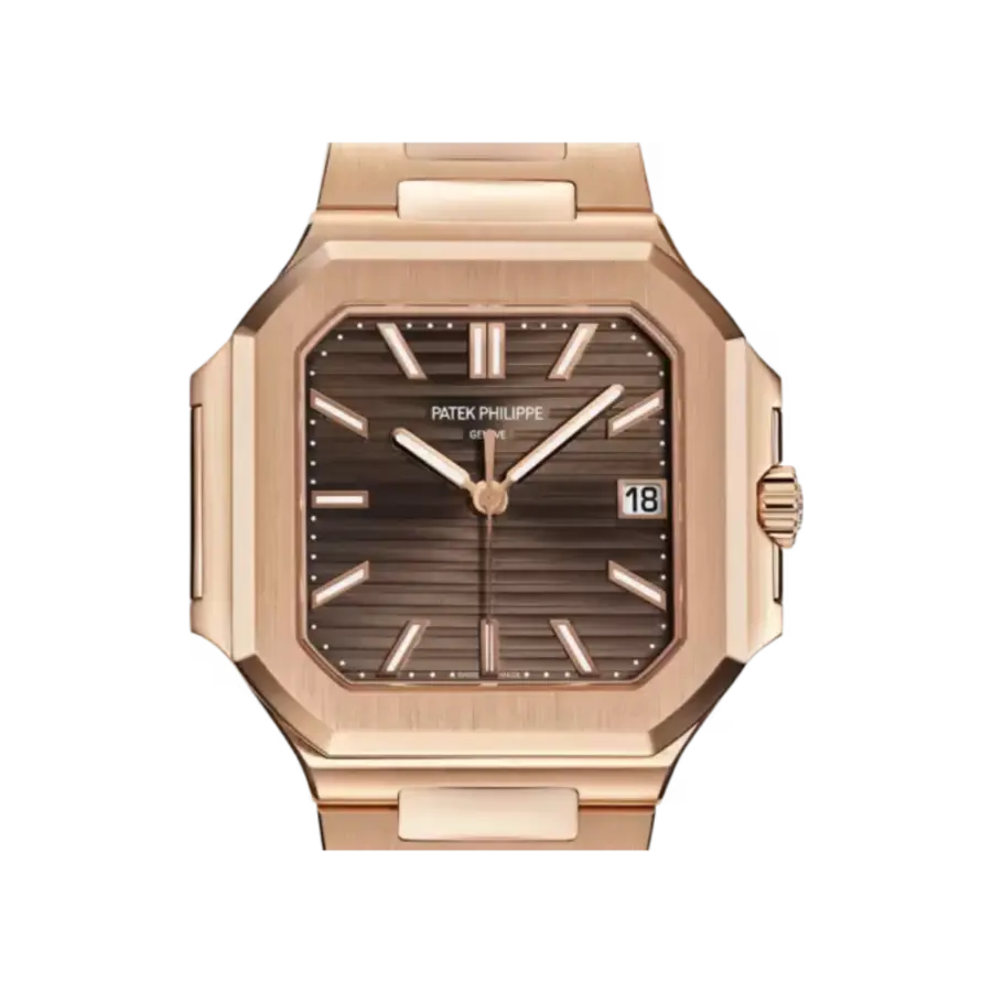 The Patek Philippe Cubitus 7128/1R-001 brings a modern, assertive aesthetic to the Maison’s new square-with-rounded-edges silhouette. In solid 18K rose gold with a distinctive sunburst brown, horizontally embossed dial, it pairs everyday practicality (date, sweep seconds) with refined haute horlogerie finishing.