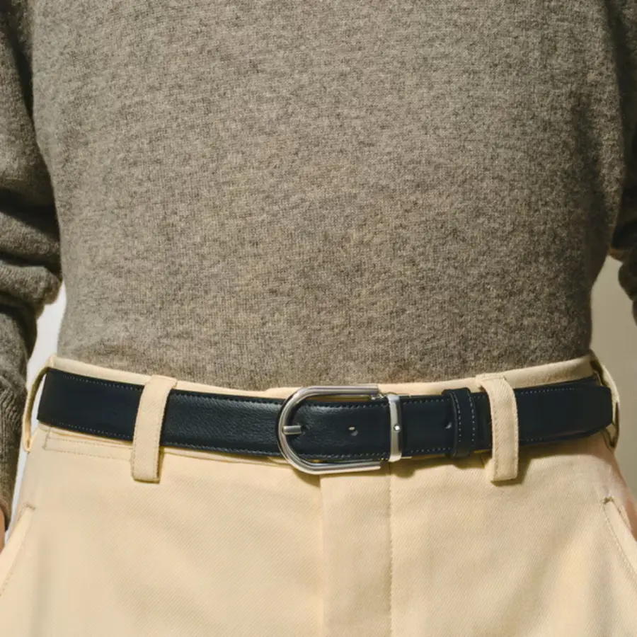 The Horseshoe Buckle Reversible Leather Belt is a versatile and elegant accessory designed for individuals who appreciate craftsmanship, adaptability, and timeless style. Made from premium full-grain leather, this belt features a sleek reversible design in black and blue, allowing effortless transitions between formal and casual looks. Its polished horseshoe buckle adds a signature detail of refined sophistication.