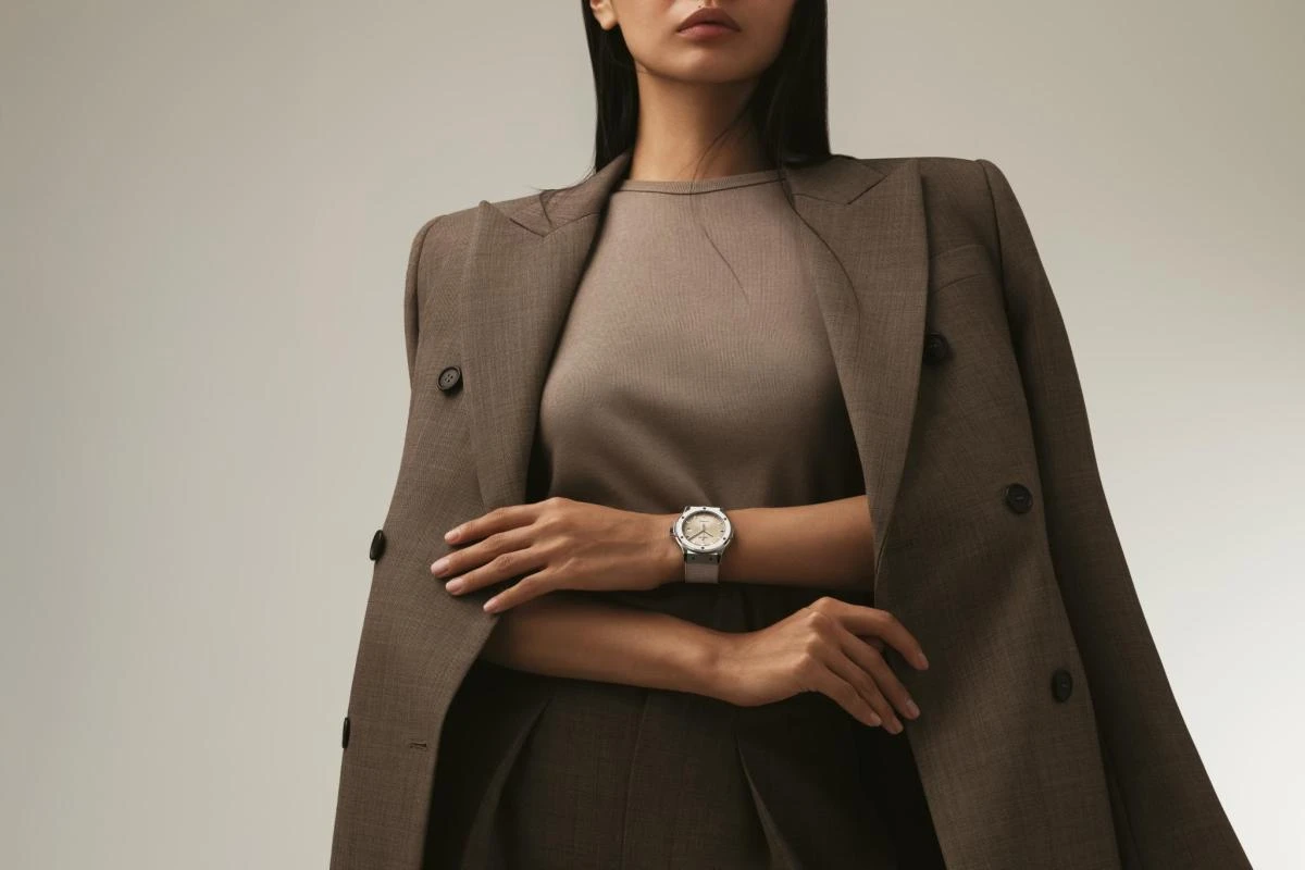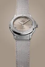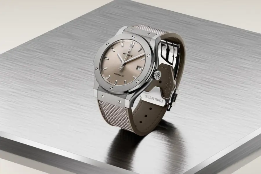 The Classic Fusion Essential Taupe 45 mm distills Hublot’s pared-back elegance into a lightweight titanium case and a refined sunray taupe dial, paired with a matching taupe strap. A minimalist daily watch with the brand’s signature “Art of Fusion” materials and finishing.
