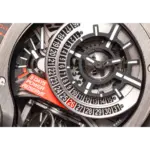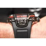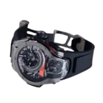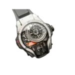 Crafted from lightweight yet robust titanium, the bold 49mm case reflects a modern, architectural design while remaining comfortable on the wrist. Its skeletonized dial reveals the intricate mechanical structure beneath, highlighted by the spectacular bi-axis tourbillon positioned at 6 o’clock — a rare and complex mechanism that creates a captivating display of constant motion.