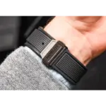 Strap: Black structured rubber strap with titanium deployant buckle.