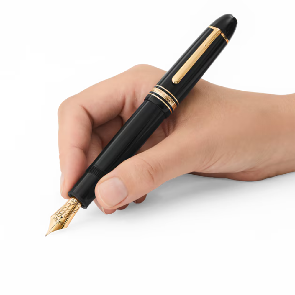 The Meisterstück 149 Calligraphy Curved Nib refines Montblanc’s flagship silhouette with an innovative curved nib for expressive line variation. Crafted in black precious resin with gold-coated accents, it balances collector appeal with everyday writing performance.