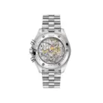 The 42 mm case is crafted from stainless steel, featuring a mix of brushed and polished surfaces that play with light beautifully on the wrist. The white step dial is a striking, contemporary touch – offering a clean, high-contrast backdrop for the blackened sub-dials, which track elapsed seconds, minutes, and hours.
