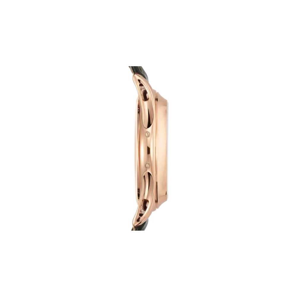 • Strap: Black alligator leather strap with 18K rose gold fold-over clasp.