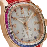 The Patek Philippe Aquanaut Luce 7968/300R-001 “Rainbow” is a dazzling celebration of color, innovation, and haute joaillerie mastery. Crafted in 18K rose gold, this contemporary 40 mm timepiece features a radiant rainbow gem-set bezel adorned with baguette-cut sapphires in graduated hues, highlighted by brilliant-cut diamonds. Its luminous mother-of-pearl dial and dynamic Aquanaut design deliver a bold yet elegant aesthetic, showcasing Patek Philippe’s ability to merge fine jewelry with horological excellence.