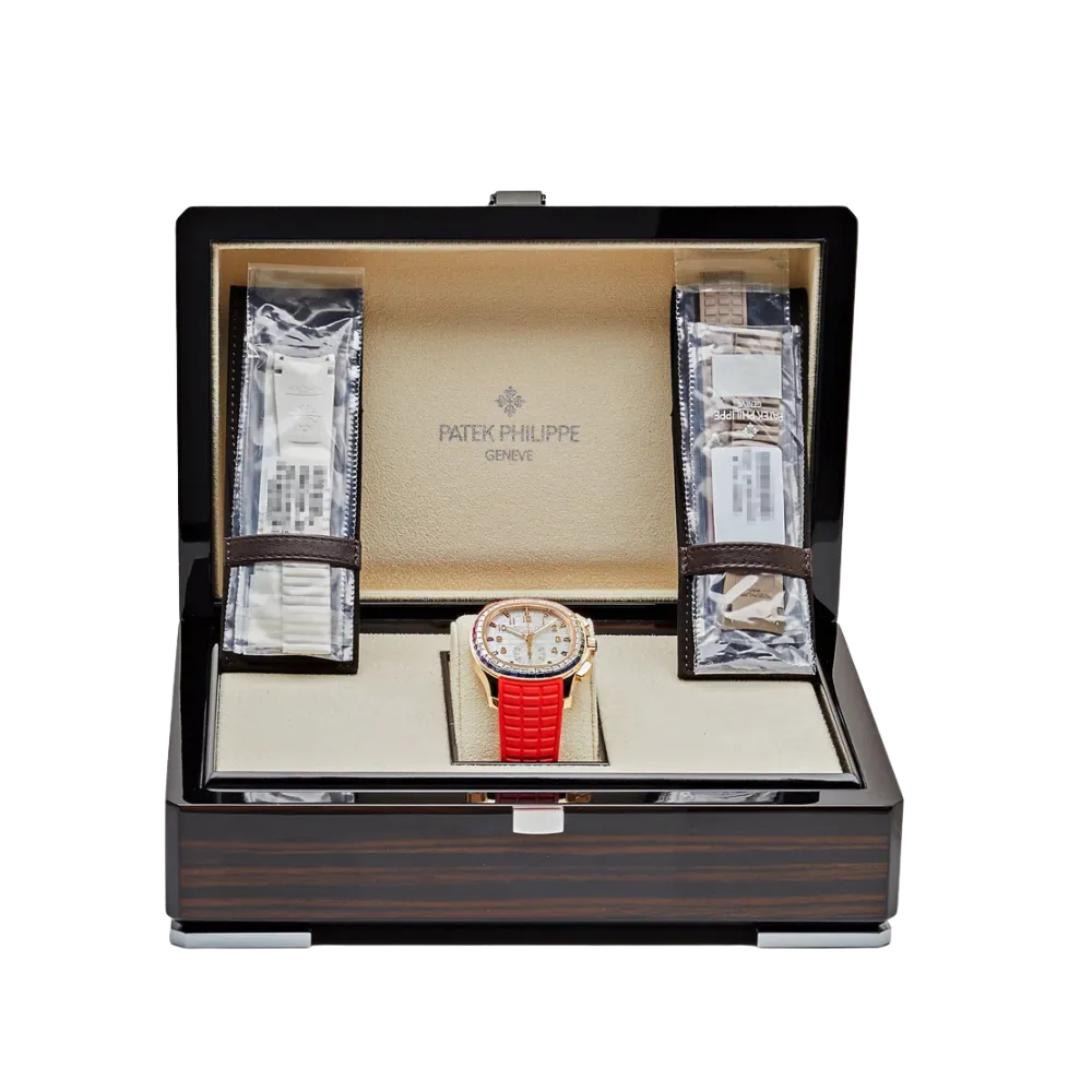 The Aquanaut Luce 7968/300R-001 is one of the boldest and most distinctive expressions of Patek Philippe’s modern design language. Its rainbow gem-set bezel and luminous mother-of-pearl dial form a symphony of light and color, while the in-house flyback chronograph movement ensures mechanical sophistication beneath the sparkle. Perfectly sized at 40 mm, this reference balances femininity with contemporary flair. A masterpiece of joyful extravagance, this watch is destined to be a centerpiece in any high jewelry or collector-grade timepiece collection.