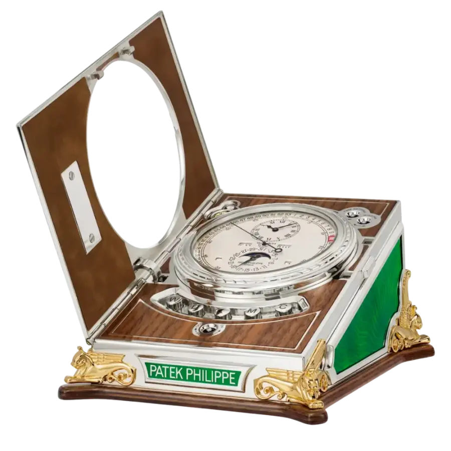 The 27000M-001 revives Patek Philippe’s storied desk-clock tradition with state-of-the-art chronometric performance and rare artisan crafts (guilloché + Grand Feu enamel). It is a showpiece for connoisseurs seeking technical innovation and decorative mastery in a singular, heirloom-grade object.