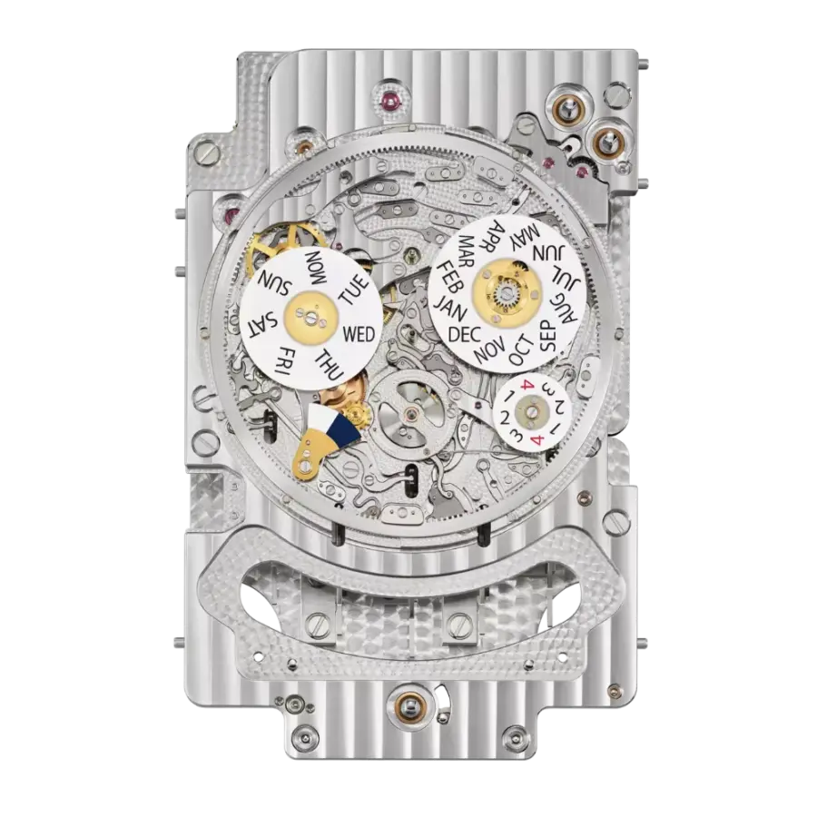 - Complications: Perpetual calendar (day, month, date; leap-year cycle), weekly calendar (ISO week via mobile frame), moon phase, day/night; central jumping seconds; 31-day power reserve indicator.