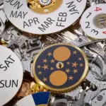 - Indications: Week number (frame), day, moon phase, month, date by hand; leap-year cycle; day/night
