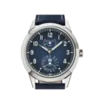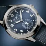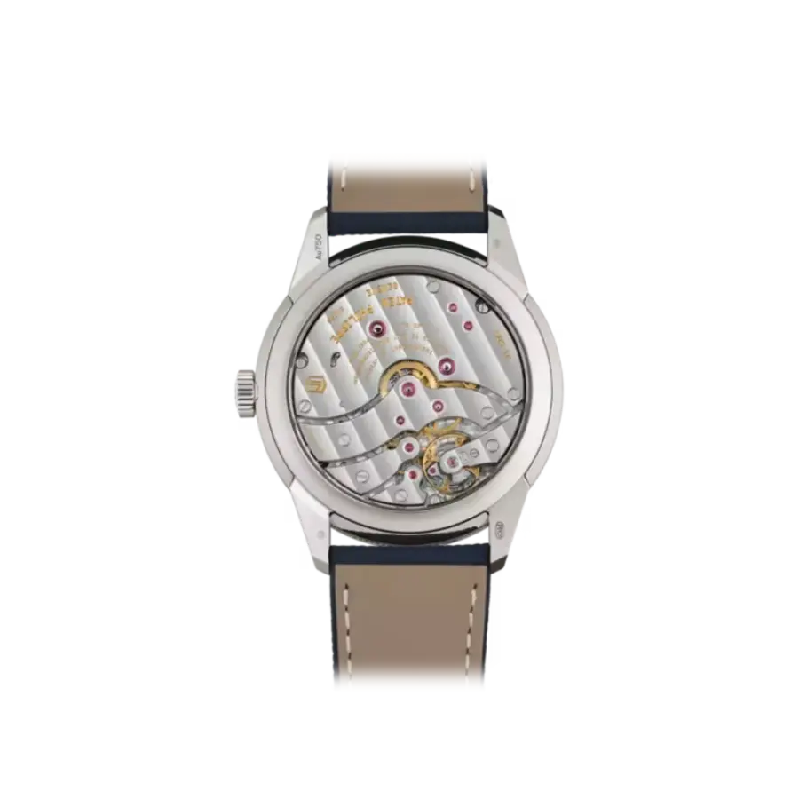 • Dial: Textured blue with gradient / fumé effect toward rim; applied white gold Arabic numerals with luminescent coating; vertical layout with power reserve at 12, day & date + small seconds at 6.