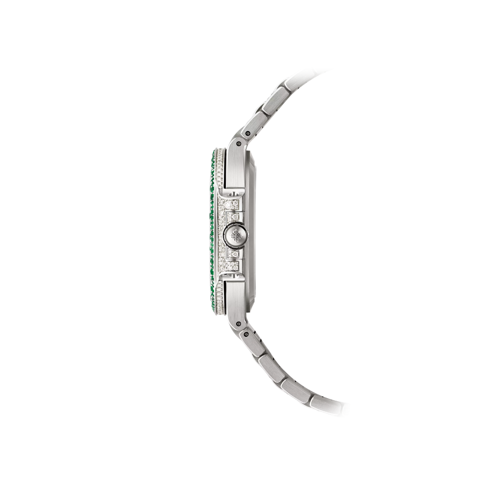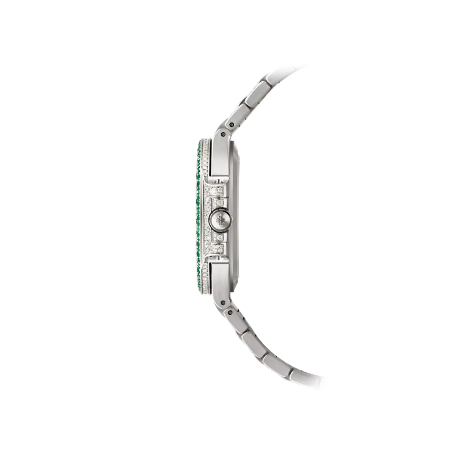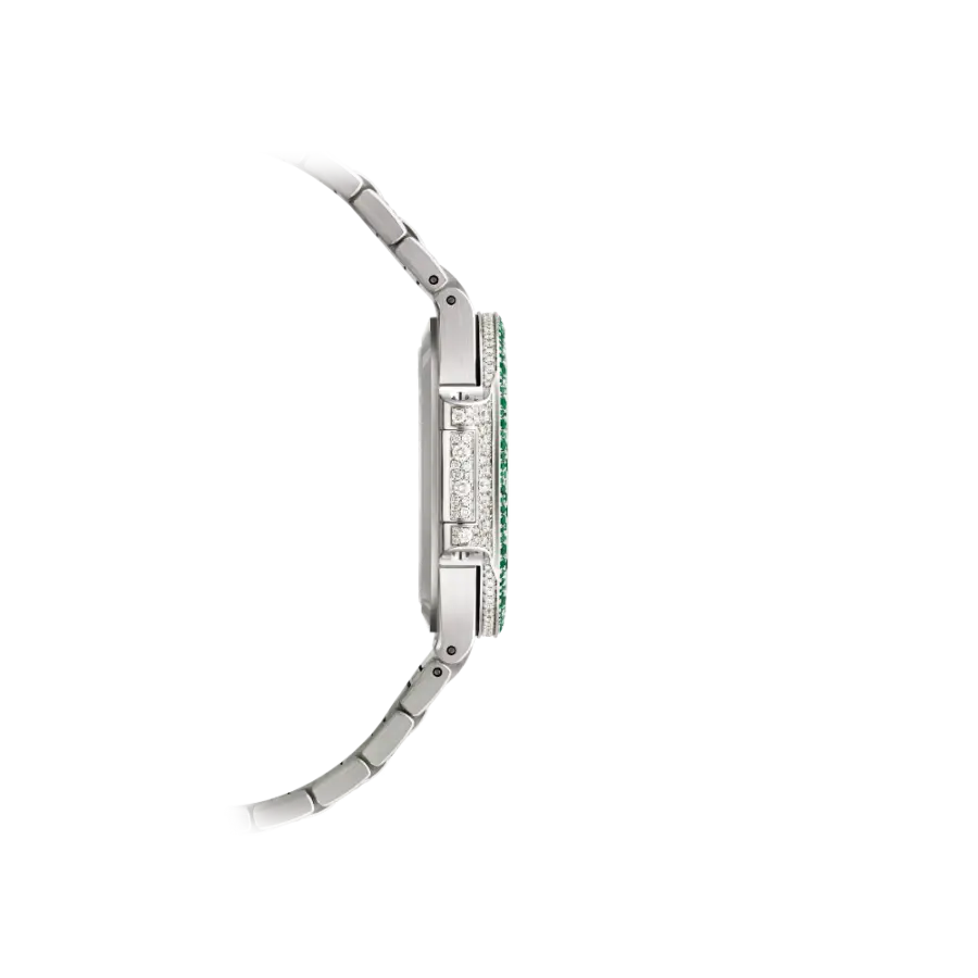 - Bracelet: Integrated 18K white gold bracelet, gem-set with diamonds and emeralds to match the case.