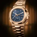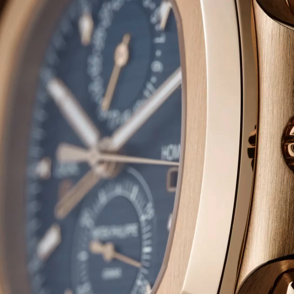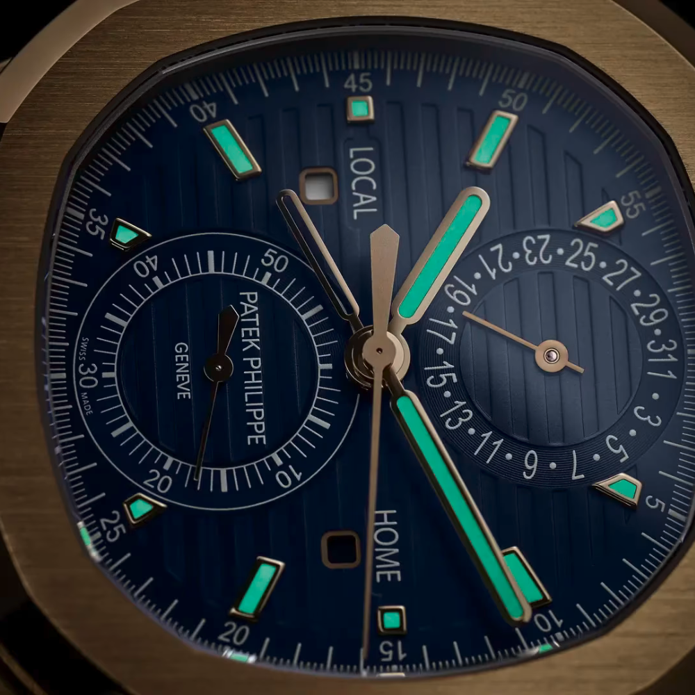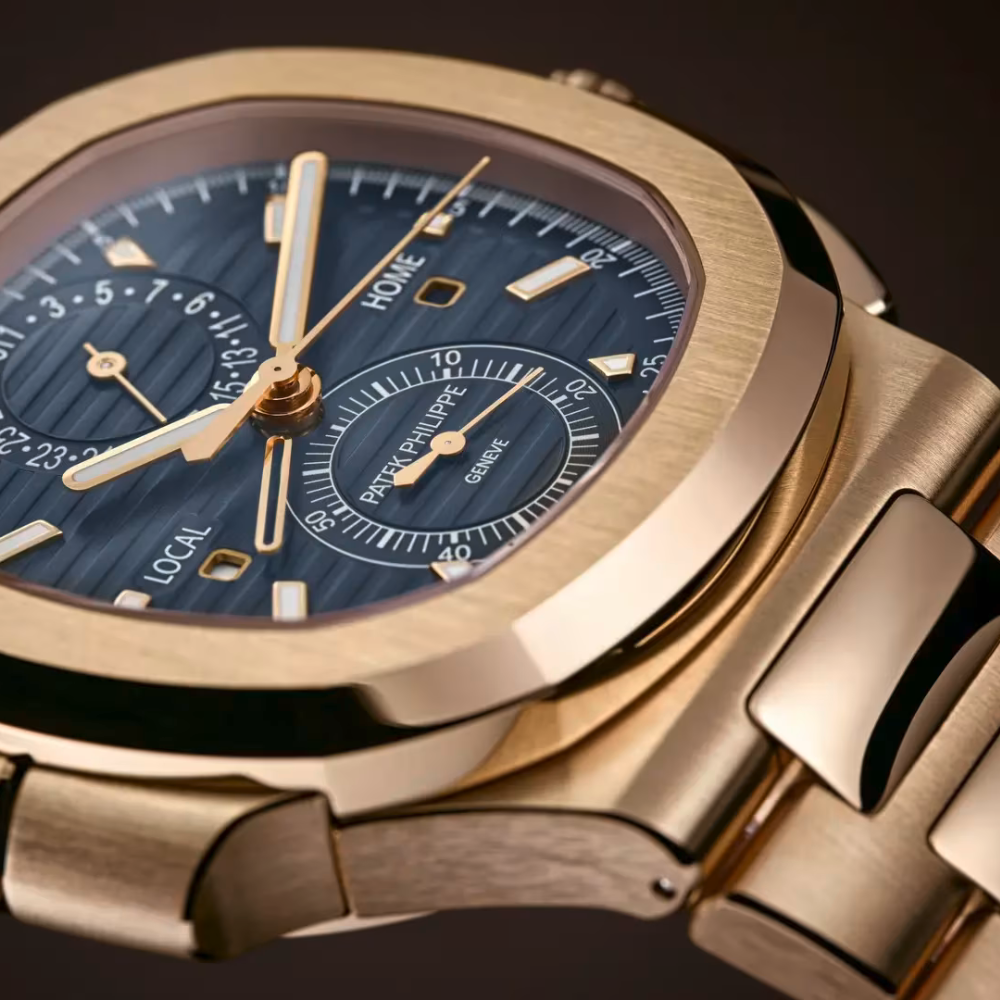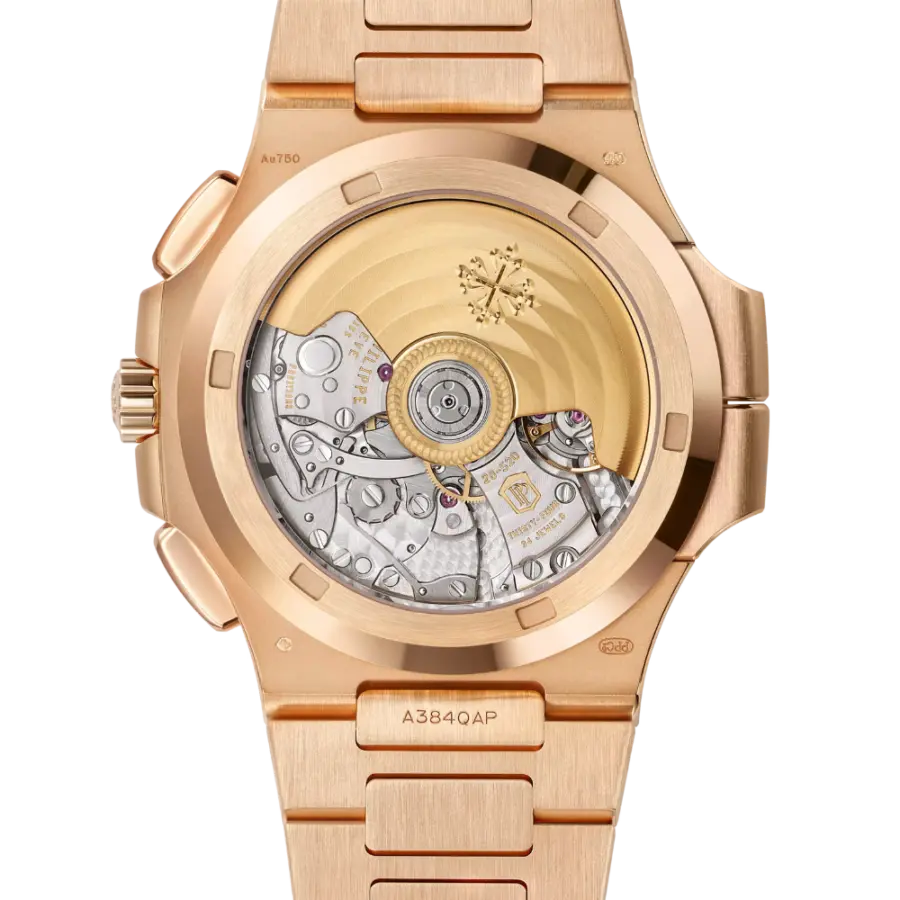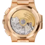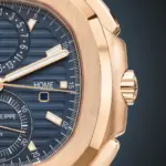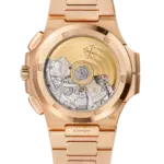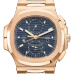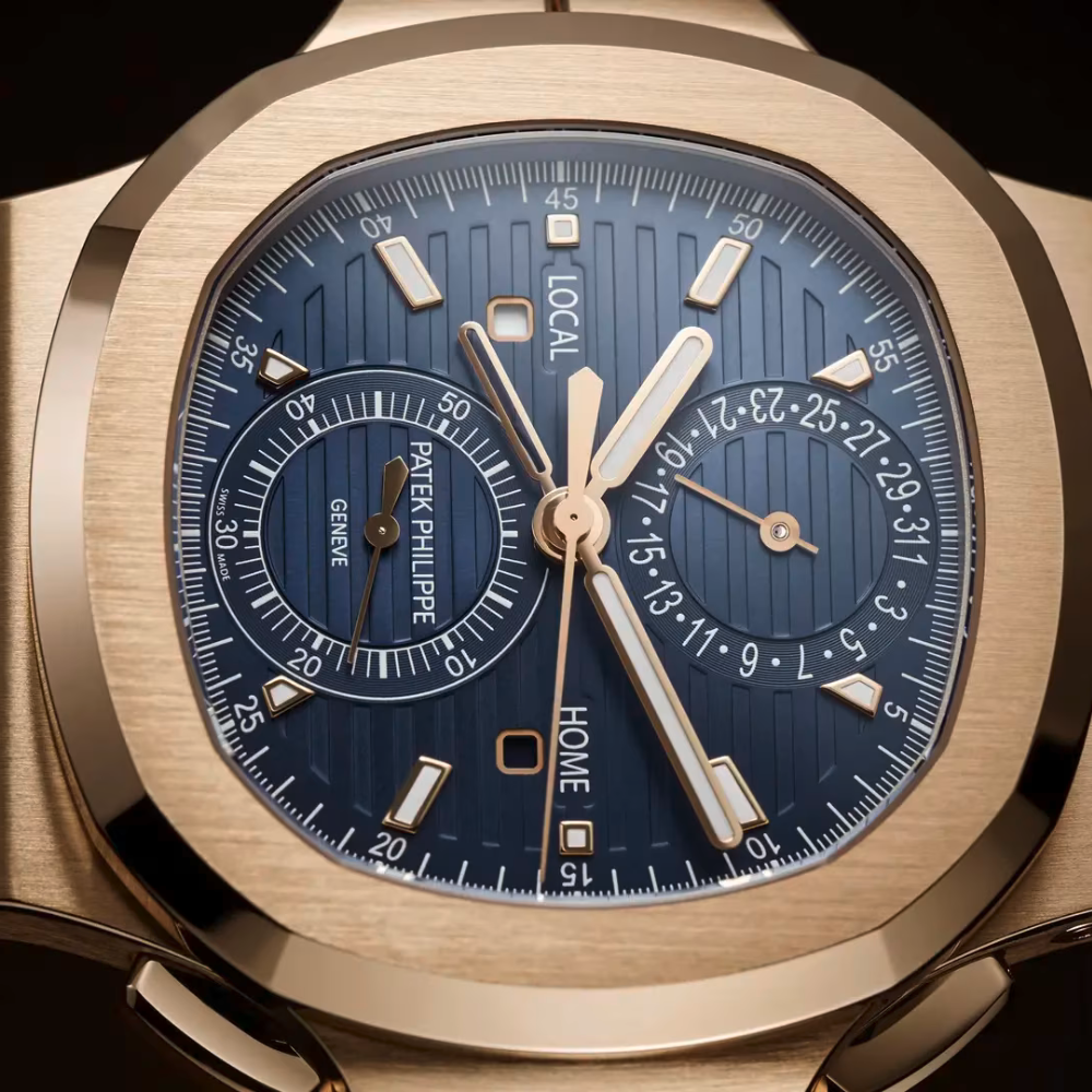 The **Patek Philippe Nautilus Ref. 5990/1R-001** represents the pinnacle of luxury sports watchmaking, merging three high-end complications into a single, elegant timepiece. Its **40.5 mm case**, sculpted from **18k rose gold**, retains the distinctive porthole silhouette of the Nautilus, enhanced by alternating polished and satin-brushed surfaces.