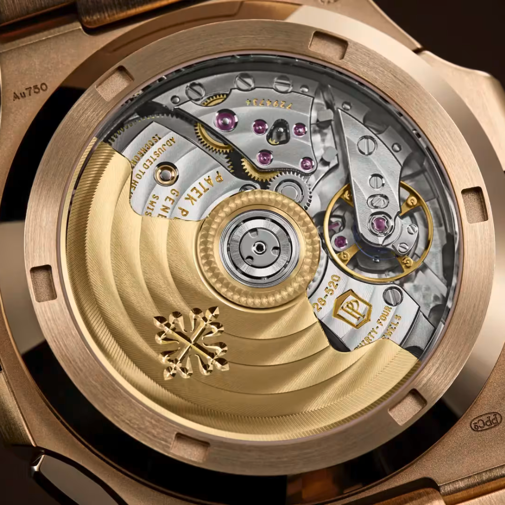 The **sunburst brown dial** with a black gradient rim enhances depth and texture, while the horizontal embossed pattern remains true to the Nautilus identity. Luminous rose gold hands and hour markers ensure superb readability in any light.