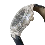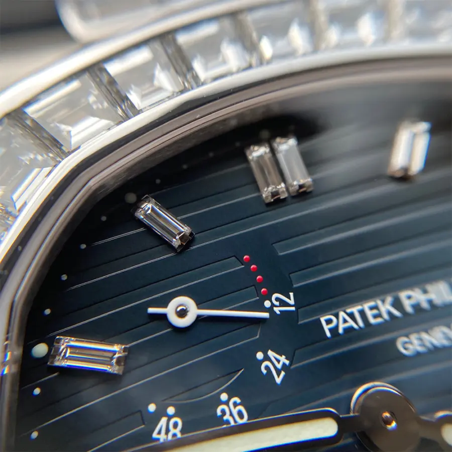 The **Patek Philippe Nautilus Ref. 5724G-001** redefines luxury in the world of sports watches, combining mechanical complexity with gem-setting artistry. Its **40 mm case** is crafted from solid **18k white gold**, featuring the iconic porthole-shaped Nautilus design by Gérald Genta, elevated by a **bezel set with 44 baguette-cut diamonds (~7.6 ct)**.