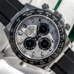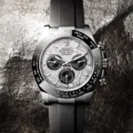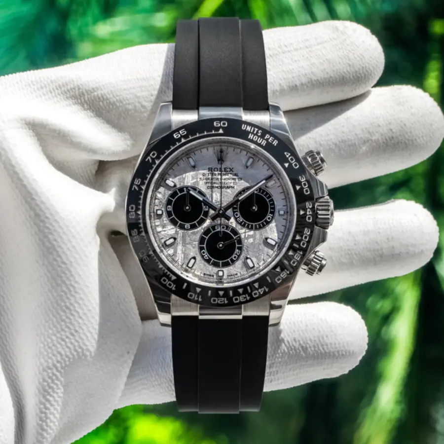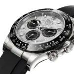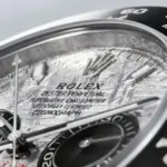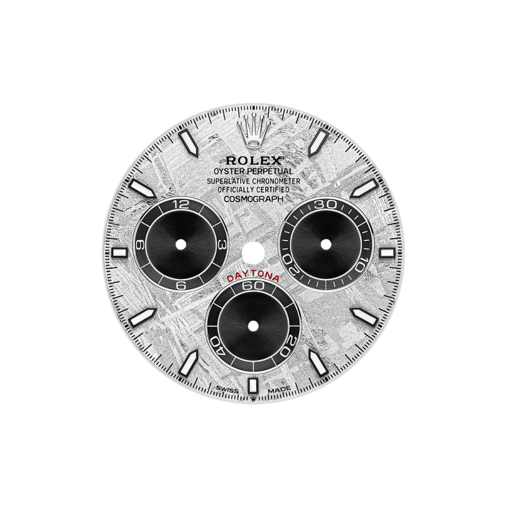 This model is the only Cosmograph Daytona with a meteorite dial. Meteorite comes from the heart of an asteroid or possibly even a planet that has exploded, propelling material across the Solar System until chance brings it into our planet’s orbit and gravity pulls it to Earth.
