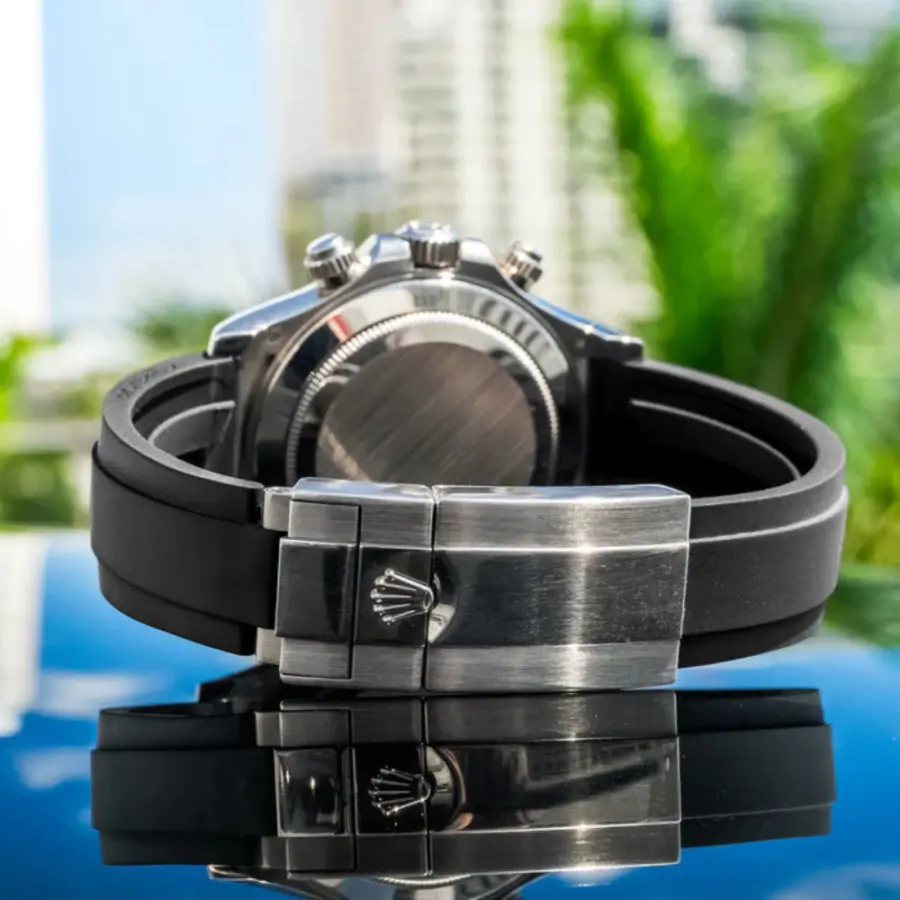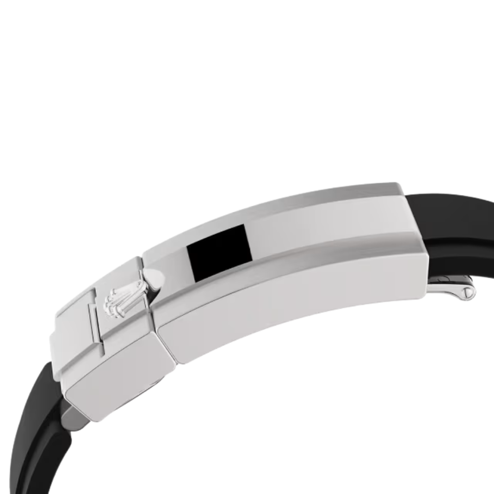 It is made up of two flexible curved metal blades – one in each bracelet section – overmoulded with high-performance black elastomer. For optimum comfort, the Oysterflex bracelet is equipped with cushions on its inner sides and an Oysterlock safety clasp to prevent accidental opening. Its length may be adjusted via the ingenious Rolex Glidelock extension system.