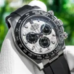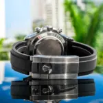 A key part of the model’s identity is the bezel moulded with a tachymetric scale for measuring average speeds of up to 400 miles or kilometres per hour. Blending high technology with sleek aesthetics, the black bezel is reminiscent of the 1965 model that was fitted with a black Plexiglas bezel insert.