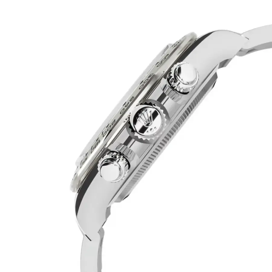 - Case: 18 kt white gold, 40 mm, with classic Oyster architecture including screw-down crown and chronograph pushers.