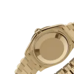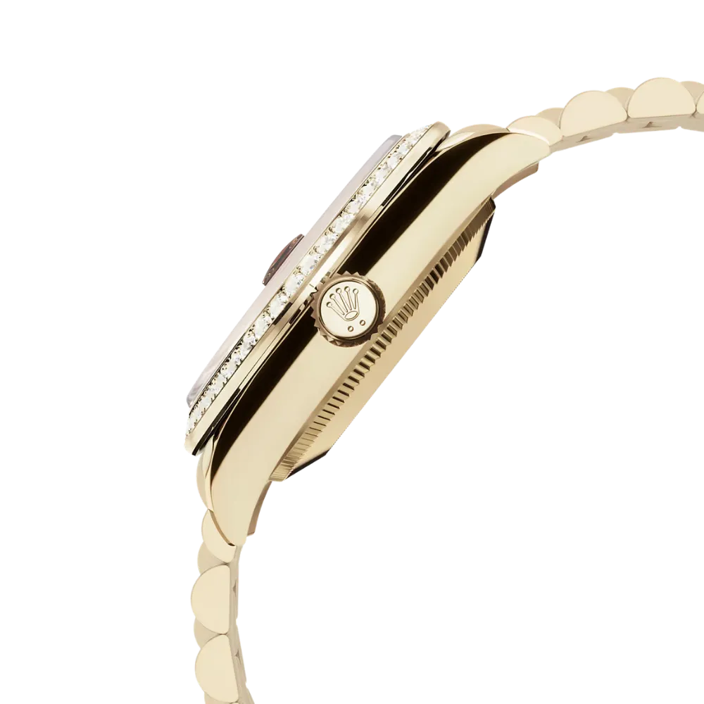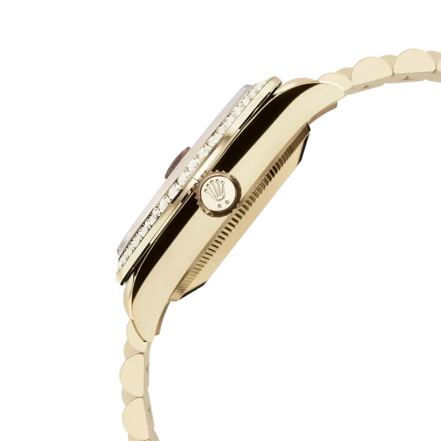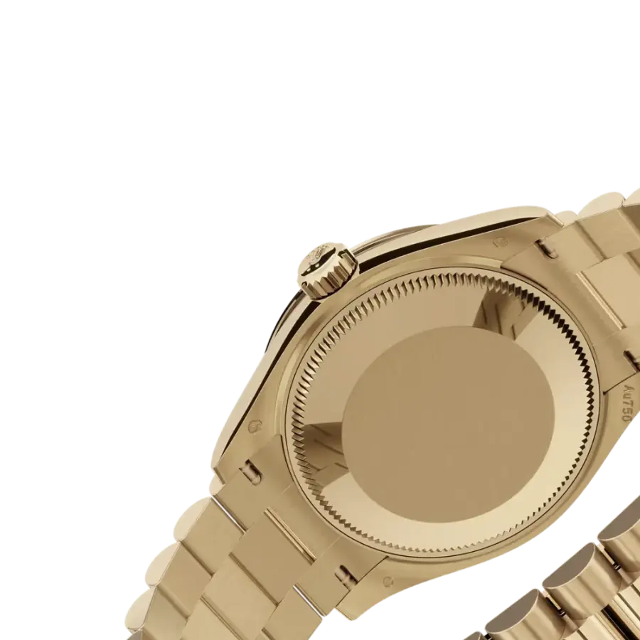 - Bracelet: 18 kt yellow gold President bracelet (three-piece semi-circular links), blending comfort and sophistication, anchored by the concealed folding Crownclasp.