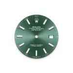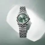 The mint green dial features a sunray finish achieved through meticulous brushing techniques, creating luminous reflections that shift gracefully with wrist movement. Complemented by Rolex’s Chromalight display, it ensures exceptional legibility in all lighting conditions.