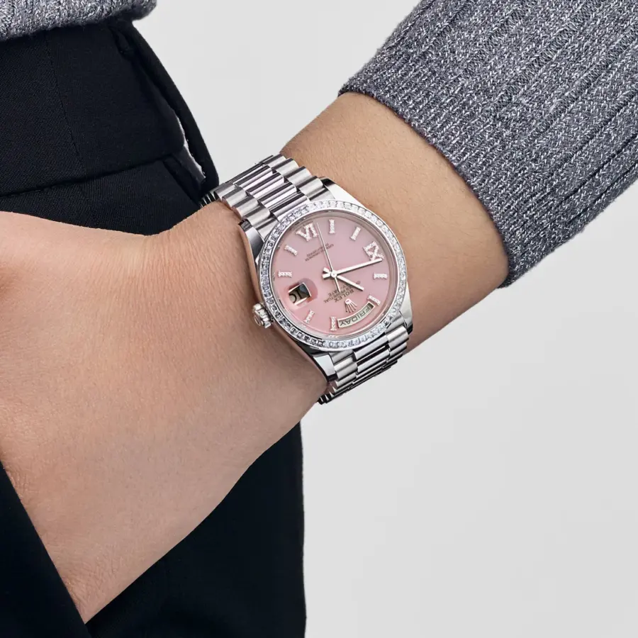 The Rolex Day-Date Ref. 128396TBR is a regal expression of Rolex’s flagship “President” line. Crafted in **platinum**, this piece features a **pink opal dial** elegantly paired with a fully **diamond-set bezel and dial**. It blends the prestige of precious metals with the artistry of gem-setting to deliver a watch that is luxurious, distinctive, and timeless.
