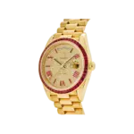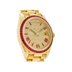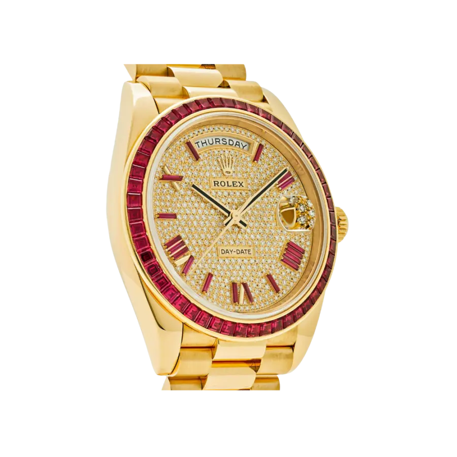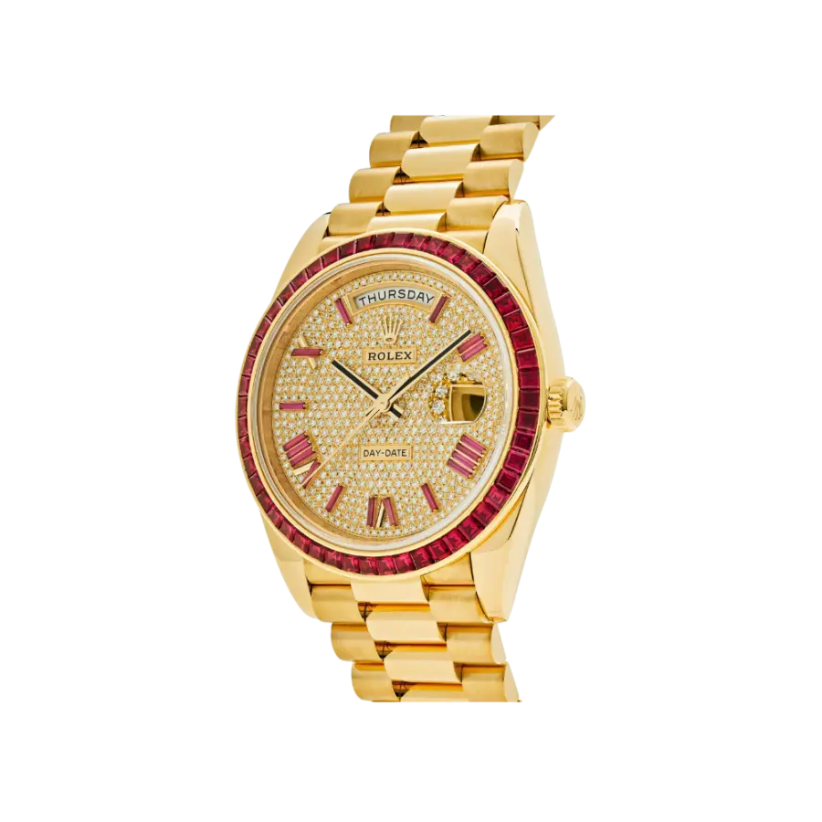 The Rolex Day-Date 40 228398TRU Yellow Gold Ruby Bezel stands as a symbol of power and exclusivity. Its bold ruby bezel, paired with the timeless elegance of the Roman numeral dial and the strength of yellow gold, makes it one of the most prestigious high-jewelry Day-Date references. An exceptional collector’s piece, it embodies Rolex’s enduring legacy of excellence, luxury, and distinction.