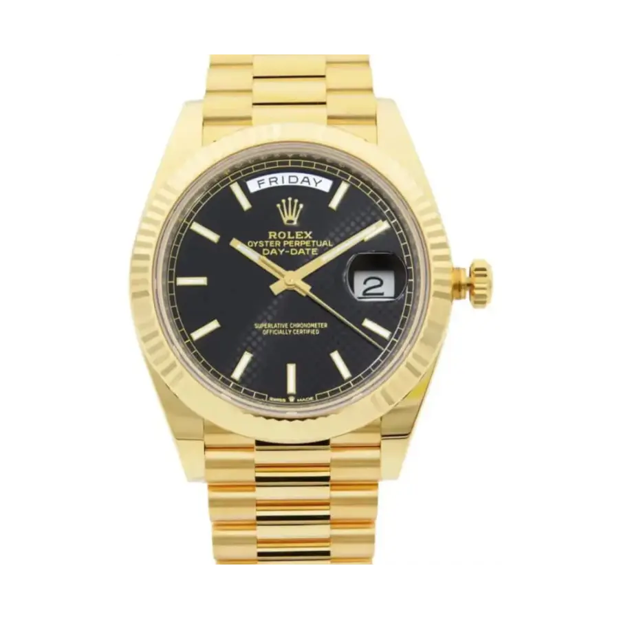 The Rolex Day-Date 40 Ref. 228238-0007 embodies the prestige of solid 18 ct yellow gold with a distinctive black diagonal-motif dial. Framed by a fluted bezel and paired with the iconic President bracelet, it blends timeless Rolex codes with a crisp, modern dial texture. Inside beats the in-house Calibre 3255 for high precision and reliability, complemented by a 100 m water-resistant Oyster case for everyday confidence.