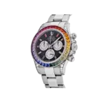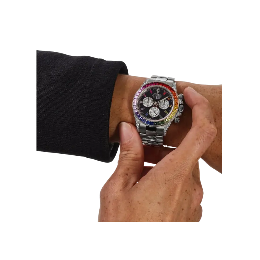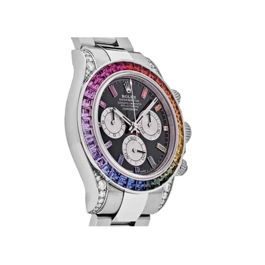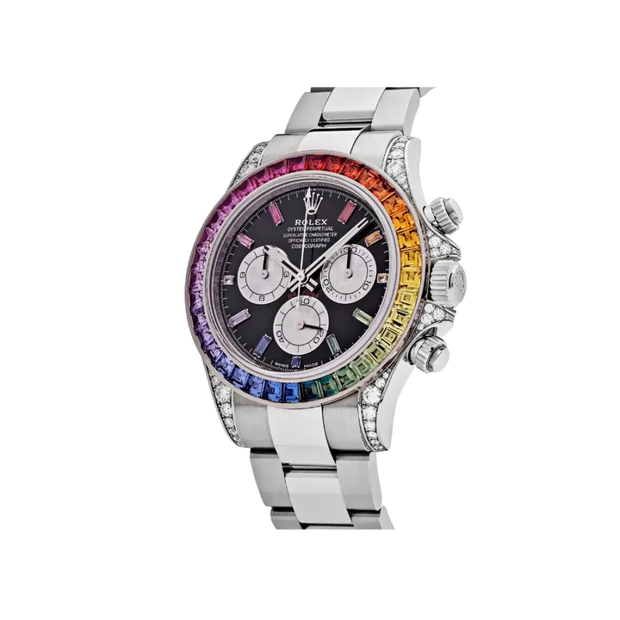 The Rolex Cosmograph Daytona 116599RBOW “Rainbow” in 18K white gold is one of the most dazzling expressions of the Daytona lineage. Combining Rolex’s legendary motorsport chronograph with the brilliance of rainbow-colored sapphires and diamonds, it is a fusion of sport and high jewelry that epitomizes exclusivity and rarity. Its vibrant bezel, precious materials, and unmistakable charisma make it a true collector’s masterpiece.
