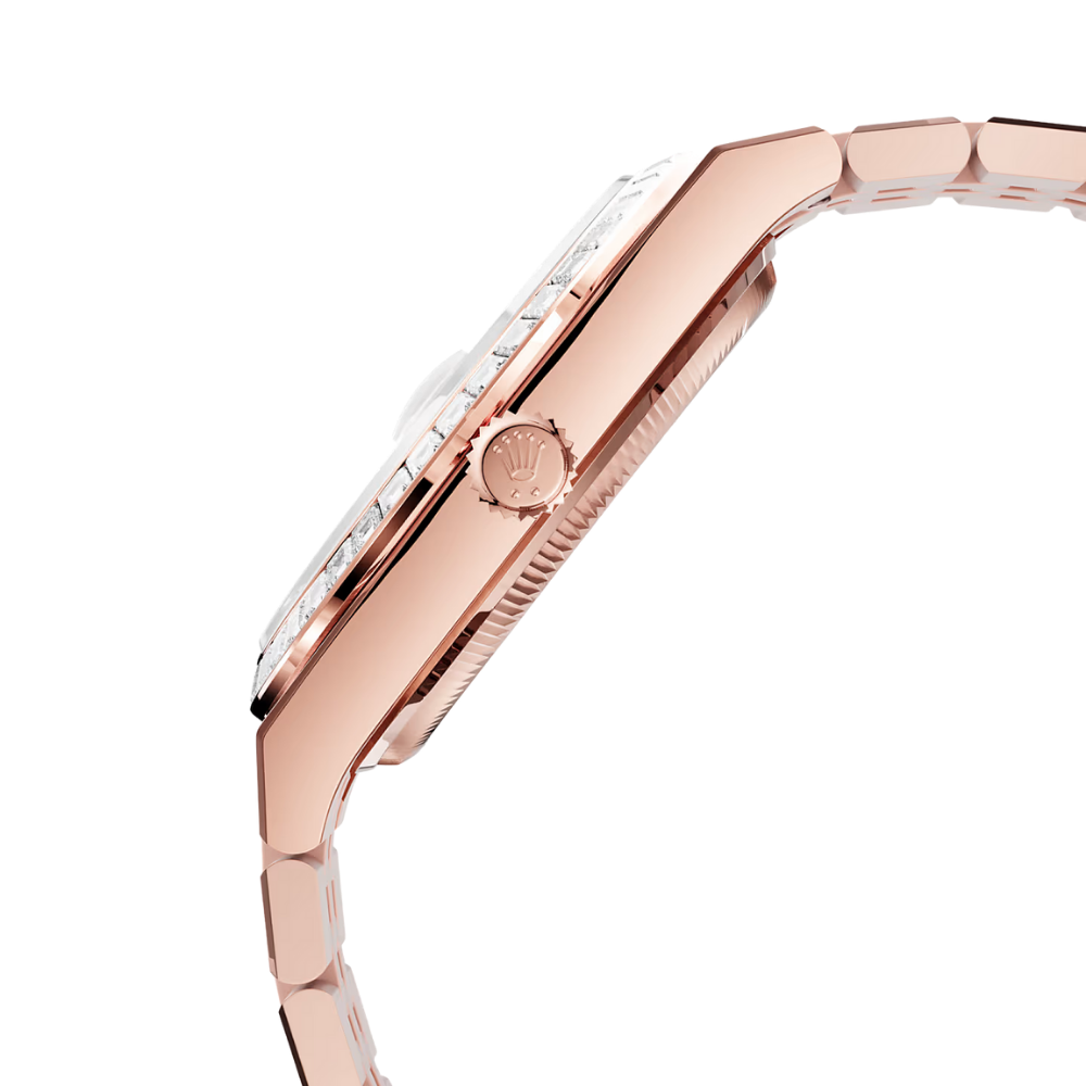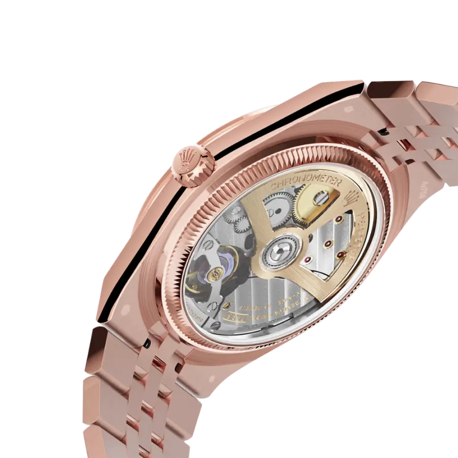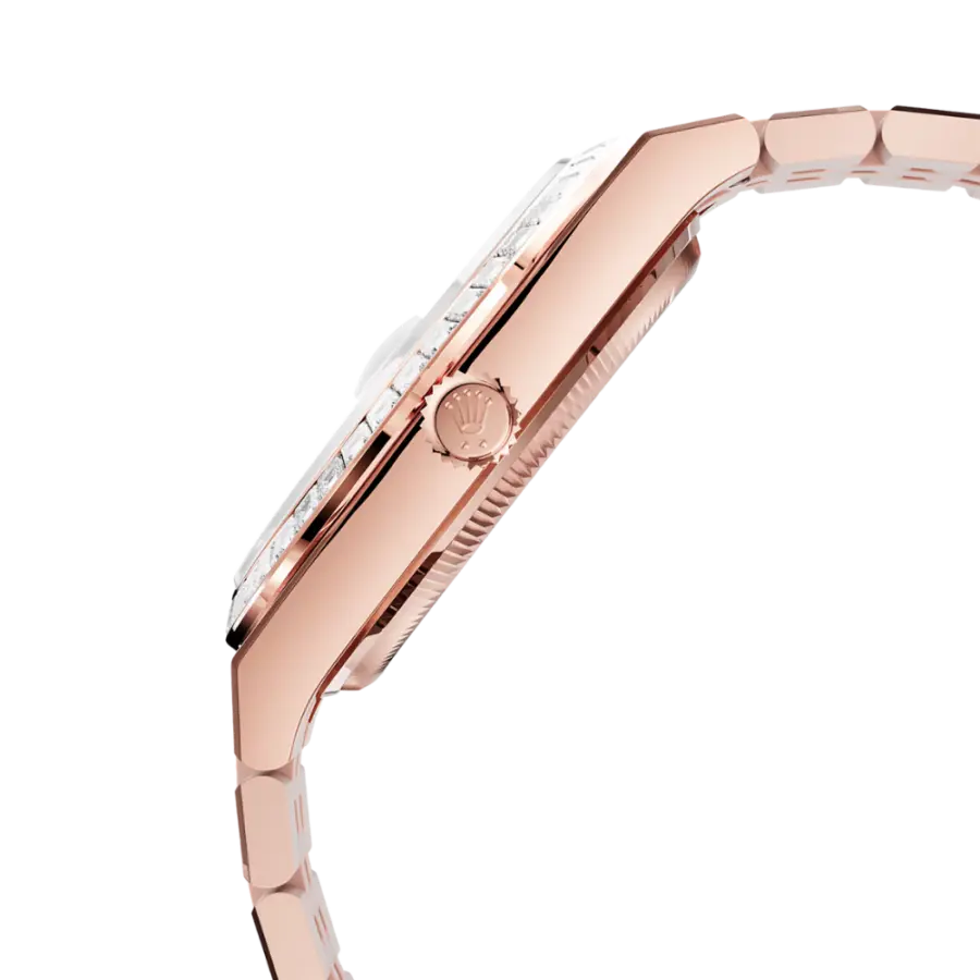 The Rolex Land-Dweller 36 mm Everose Gold & Diamonds Ref. 127285TBR reimagines the Land-Dweller line in a compact yet opulent form. Crafted from 18 kt Everose gold and adorned with a diamond-set bezel, this 36 mm Oyster case offers both refinement and versatility. The warm tones of Everose gold contrast beautifully with the brilliance of diamonds, creating a timepiece that is equally suited for daily wear or special occasions.
