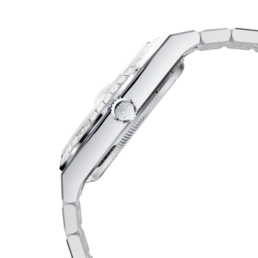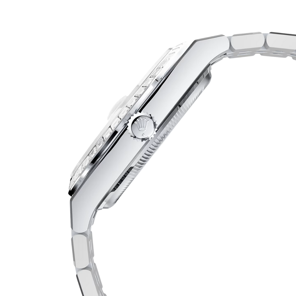 The Rolex Land-Dweller 36 mm Platinum & Diamonds Ref. 127286TBR brings a new level of refinement to the Land-Dweller family, combining the enduring strength of the Oyster case with the brilliance of diamond embellishment. Crafted in 950 platinum and accented with a diamond-set bezel, this 36 mm model is a perfect choice for those who appreciate a more understated size while still embracing exclusivity and elegance.