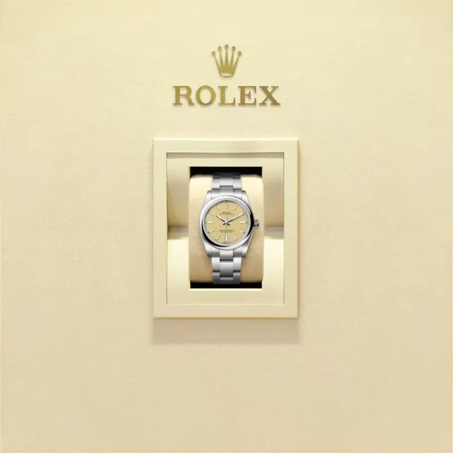 - Case: Oyster case in Oystersteel, 34 mm; monobloc middle case with screw-down case back and crown.