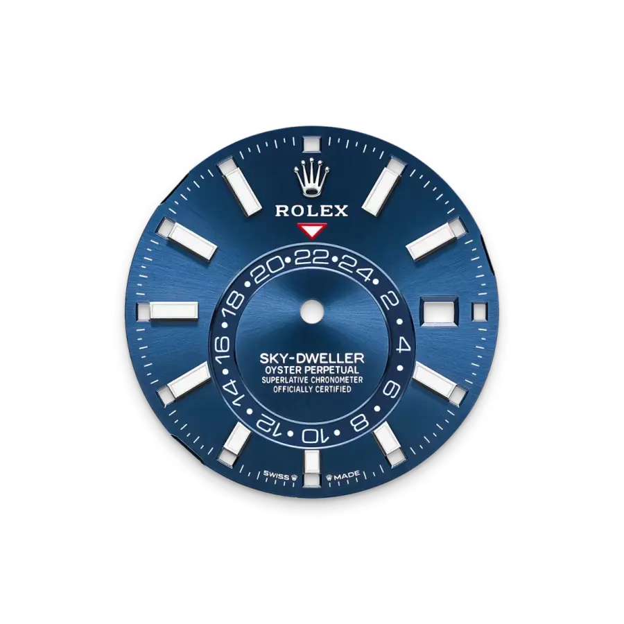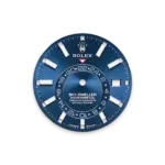The Rolex Sky‑Dweller 42 (Ref. 326934‑0003) combines global travel functionality with refined luxury. In White Rolesor (Oystersteel and 18 kt white gold), this model features the elegant signature fluted bezel in white gold and a vibrant blue sunray dial set with Chromalight hour markers, ideal for the modern traveler.
