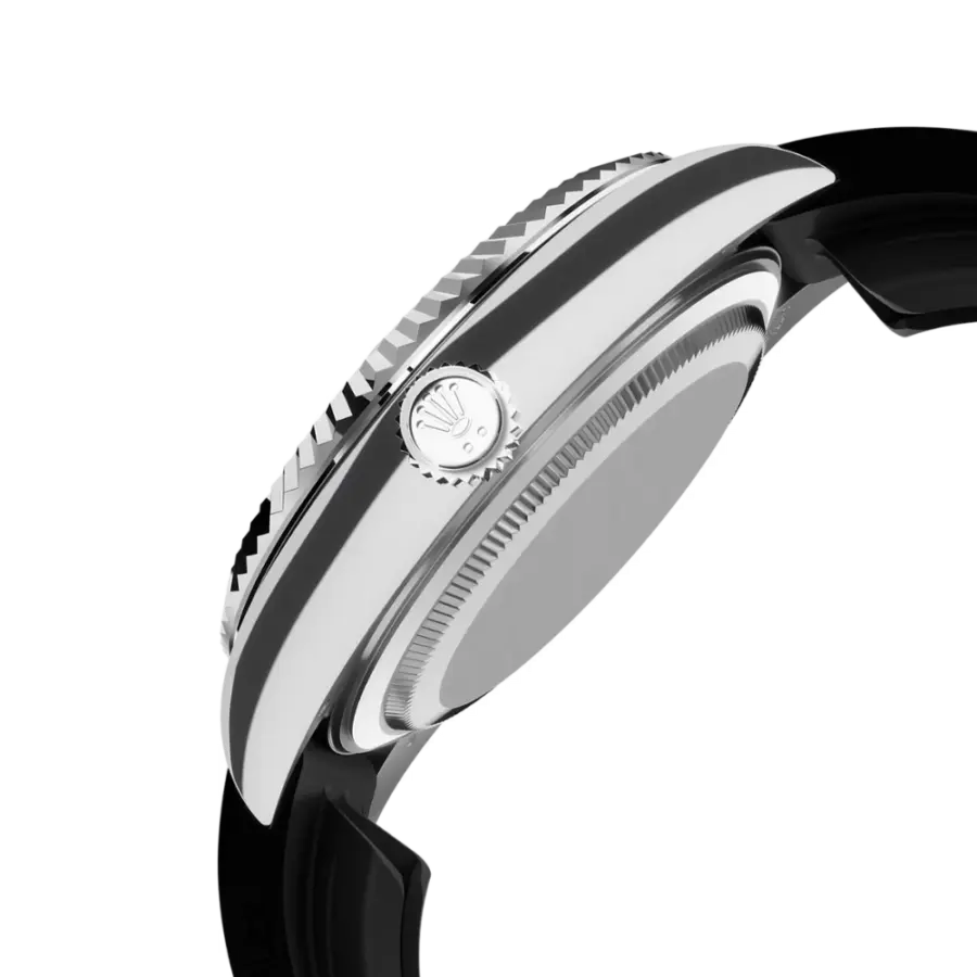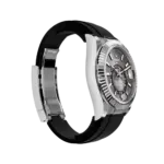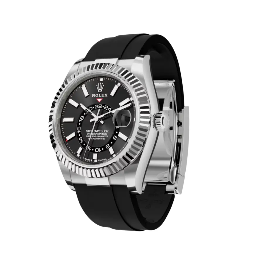 The Rolex Sky-Dweller M336239-0002 blends luxury and functionality with a 42 mm white gold case, fluted bezel, and bright black dial. Designed for travelers, it features dual time zones, an annual calendar, and Rolex’s signature Ring Command bezel for intuitive control.