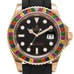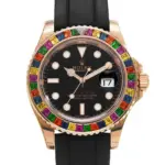 The Rolex Yacht-Master 116695SATS pushes the boundaries of what a luxury sports watch can be. With its radiant rainbow bezel, sleek black dial, and Everose gold elegance, it’s a statement of style and sophistication. Backed by Rolex’s craftsmanship, it’s a highly desirable piece for collectors seeking both excellence and visual impact.