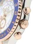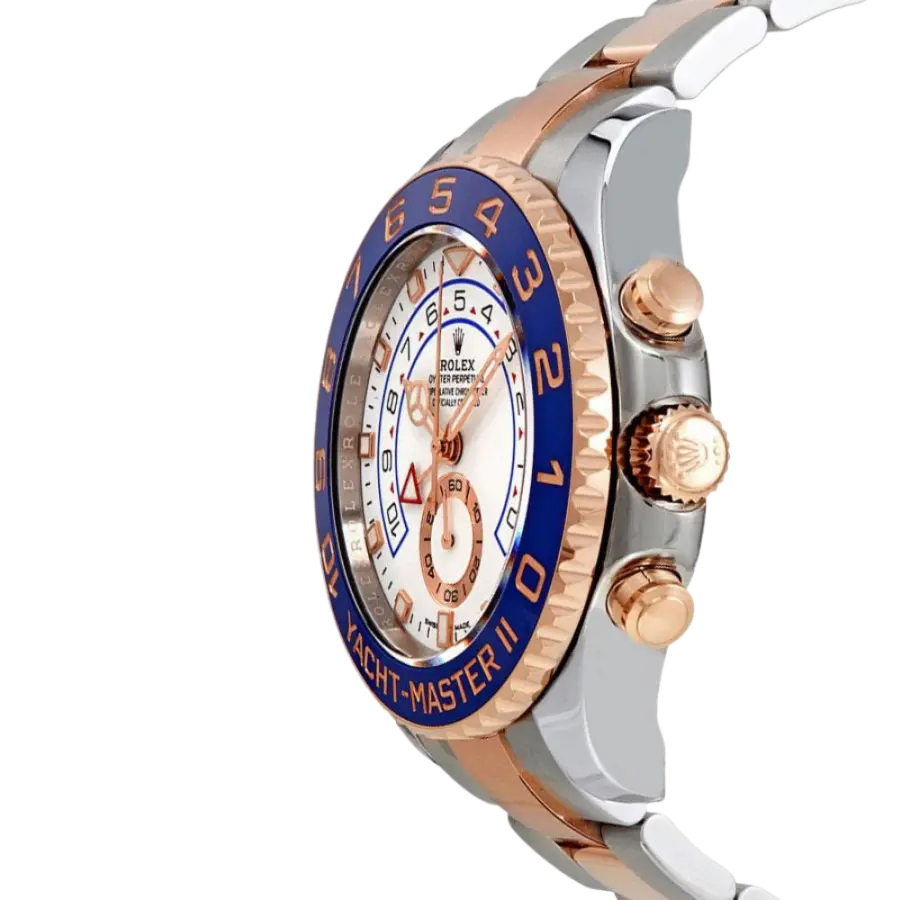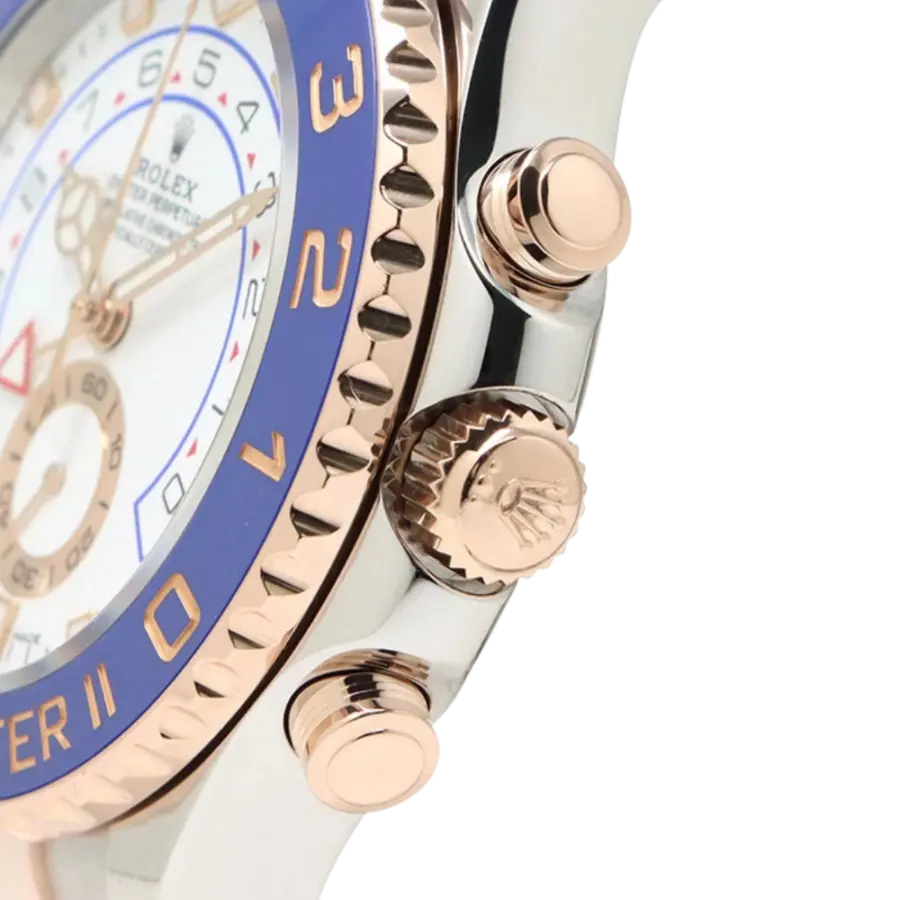 The Rolex Yacht-Master II Ref. 116681-0002 is a sailing chronograph engineered for precision regatta timing while showcasing an elegant two-tone design of stainless steel and Everose gold. Its innovative Ring Command bezel allows intuitive control of the countdown function, making it unique among modern chronographs. With a robust 72-hour power reserve, 100 m water resistance, and a bold 44 mm case, this Yacht-Master II is both a tool for sailors and a statement of prestige, appealing to enthusiasts who value sport functionality paired with luxury aesthetics.