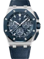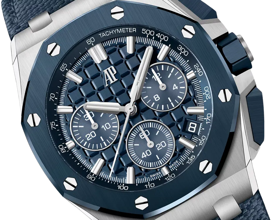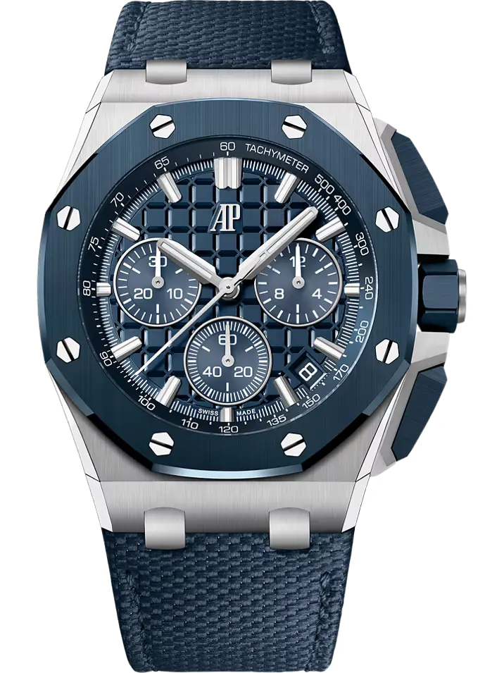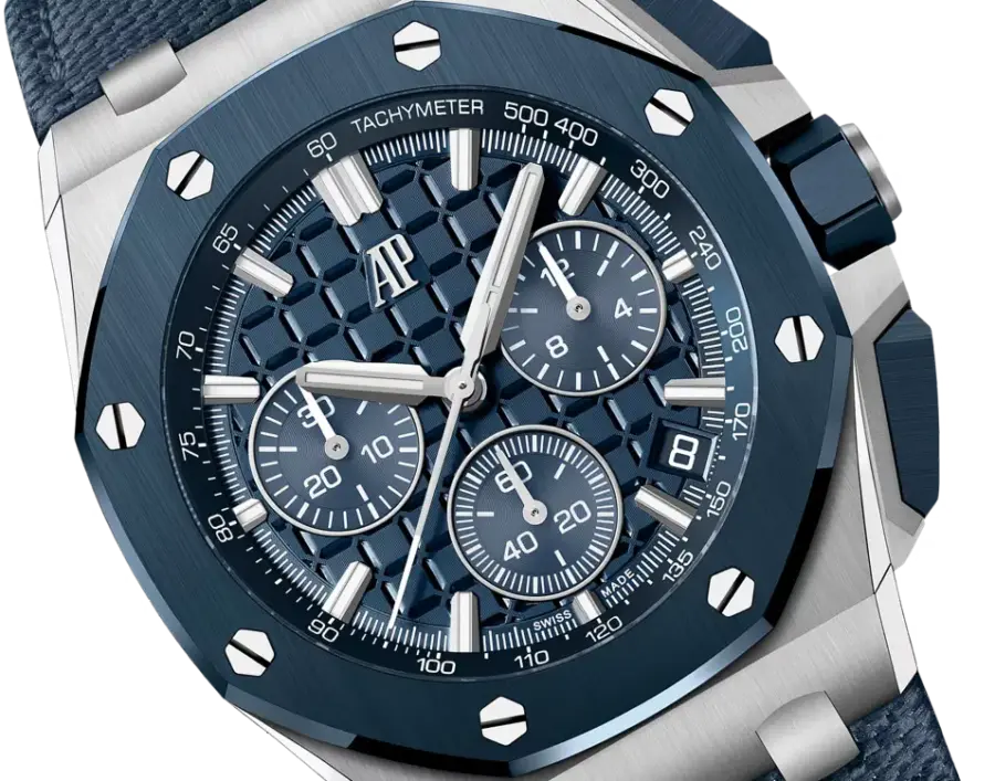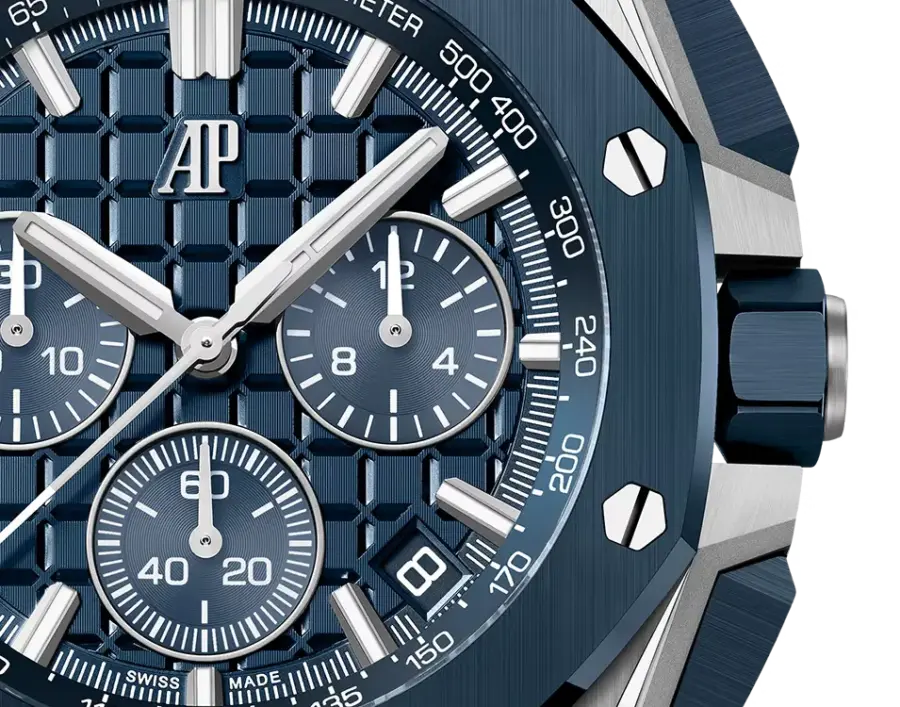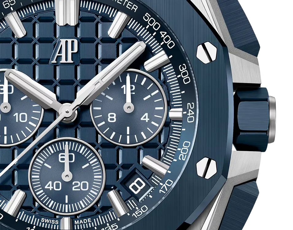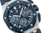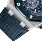 • Strap: Interchangeable Bleu Nuit textured leather strap with stainless-steel AP pin buckle; includes an additional Bleu Nuit rubber strap.