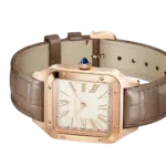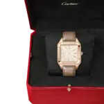 The Santos-Dumont watch Ref. WGSA0112 is a refined and luxurious interpretation of one of Cartier’s earliest wristwatch designs. Crafted in 18K rose gold with a diamond-set bezel, this elegant creation captures the pioneering spirit of Alberto Santos-Dumont while showcasing Cartier’s jewelry-watchmaking mastery.