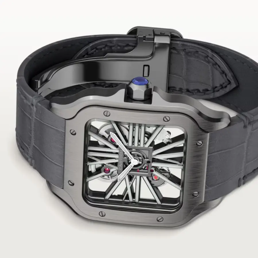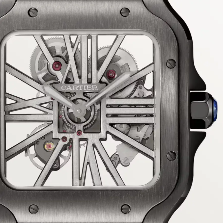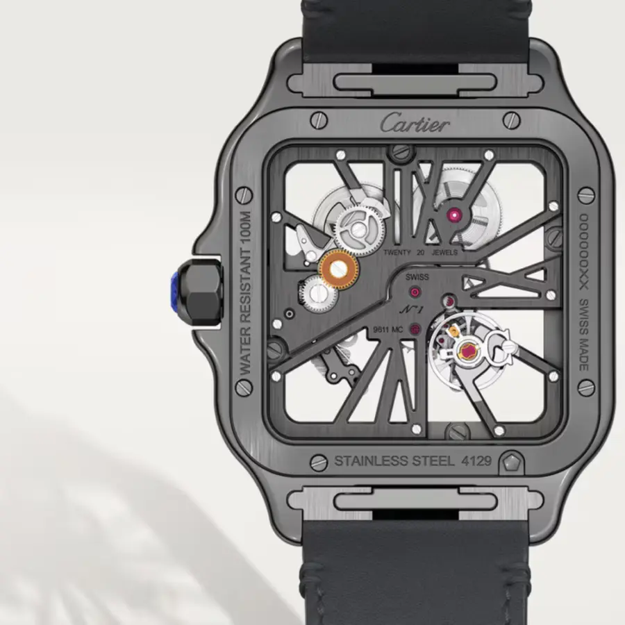 Crafted from stainless steel and enhanced with a sleek black ADLC-coated bezel, this 39.8 mm x 47.5 mm case showcases bold geometry and Cartier’s iconic square shape. The skeleton dial is a true visual statement, where the Roman numeral hour markers are actually part of the movement’s bridges — a feat of technical and artistic ingenuity.