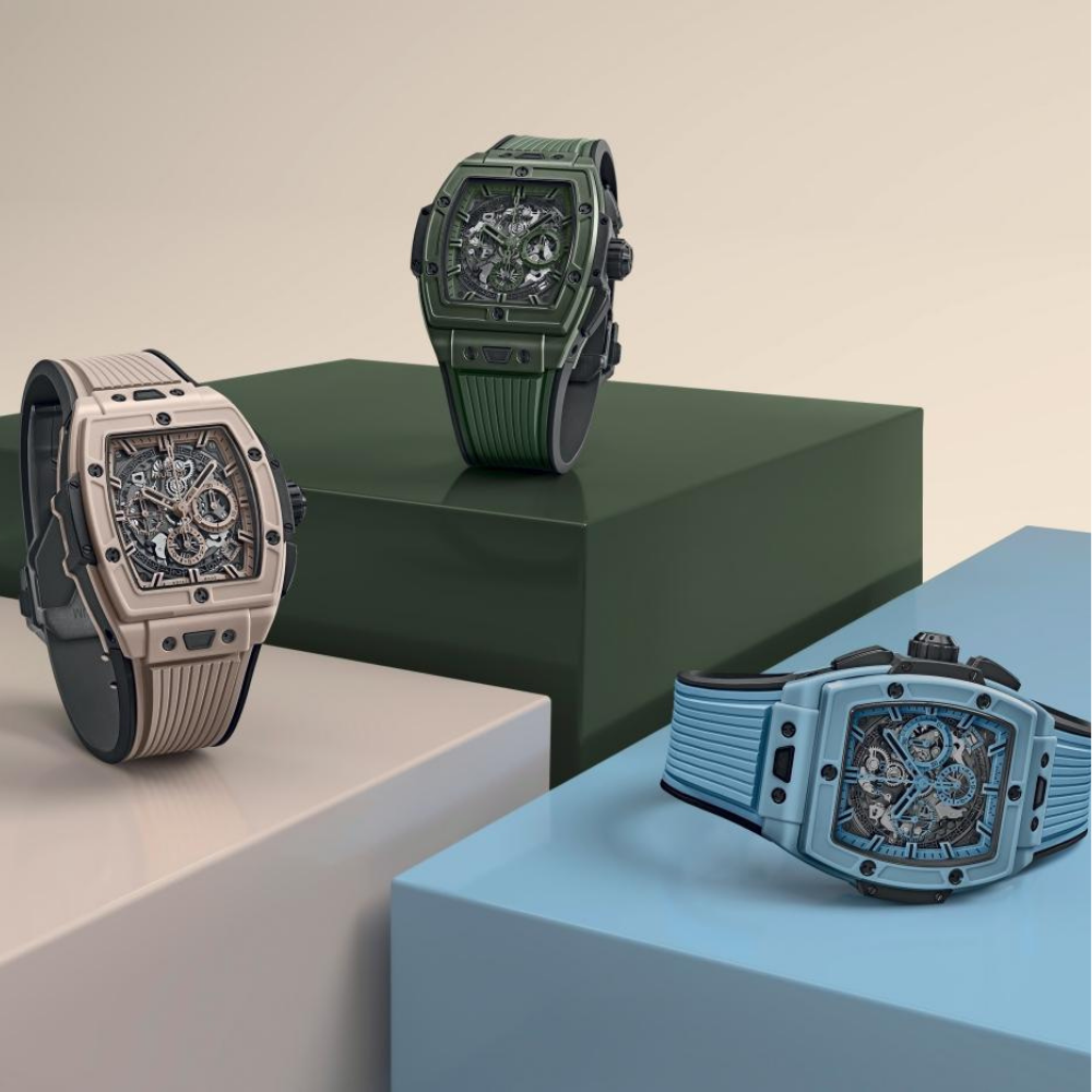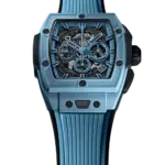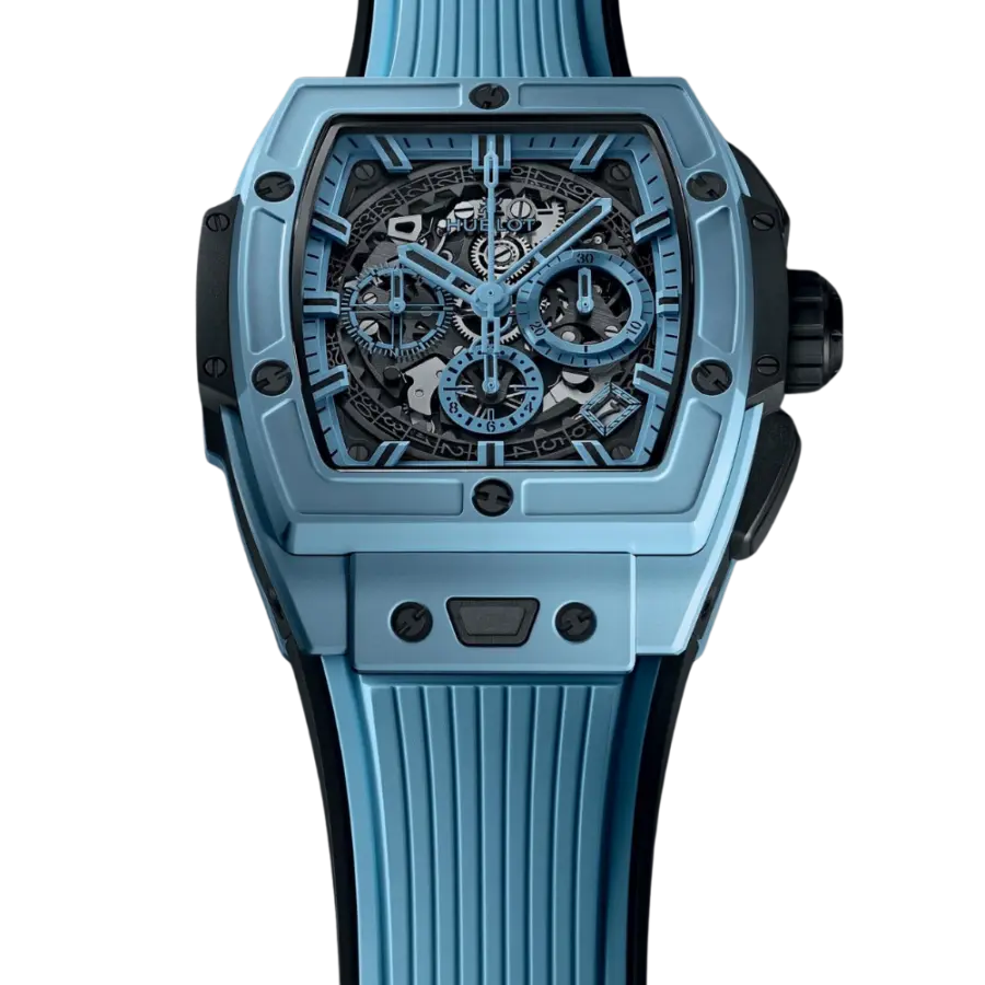 The Hublot Spirit of Big Bang Sky Blue Ceramic is a refreshing take on contemporary watchmaking, housed in a bold tonneau-shaped case crafted from polished and microblasted sky-blue ceramic. Limited to 200 pieces, this 42 mm timepiece embodies Hublot’s “Art of Fusion,” blending avant-garde design with the precision of the skeletonized HUB4700 chronograph movement.
